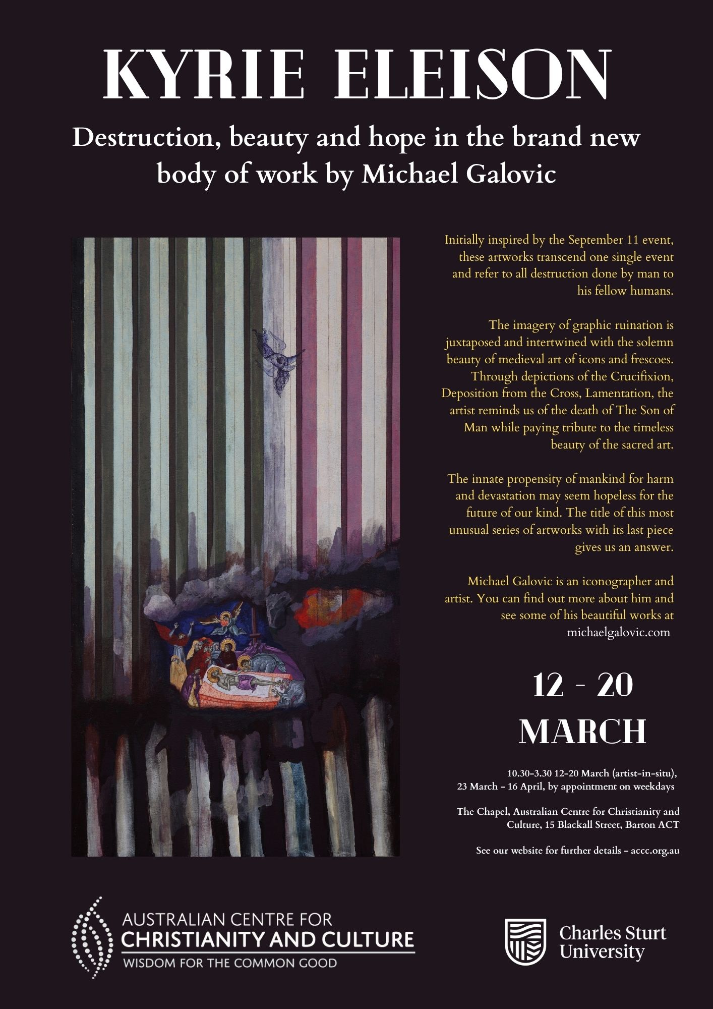 The imagery of graphic ruination is juxtaposed and intertwined with the solemn beauty of medieval art of icons and frescoes. Through depictions of the Crucifixion, Deposition from the Cross, Lamentation, the artist reminds us of the death of The Son of Man while paying tribute to the timeless beauty of the sacred art.