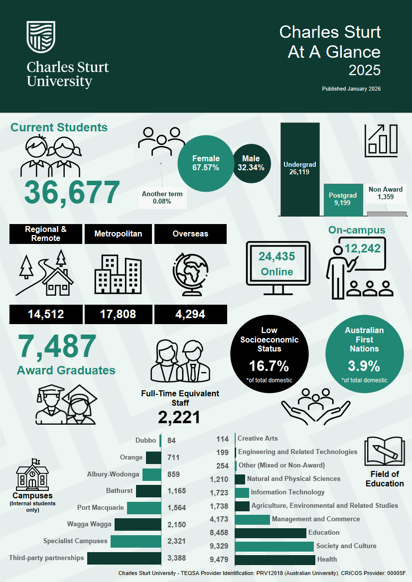 Charles Sturt at a Glance provides a brief summary of Charles Sturt – including student numbers, mission, campuses and student demographics. Charles Sturt at a Glance is updated with full year information in January the following year.