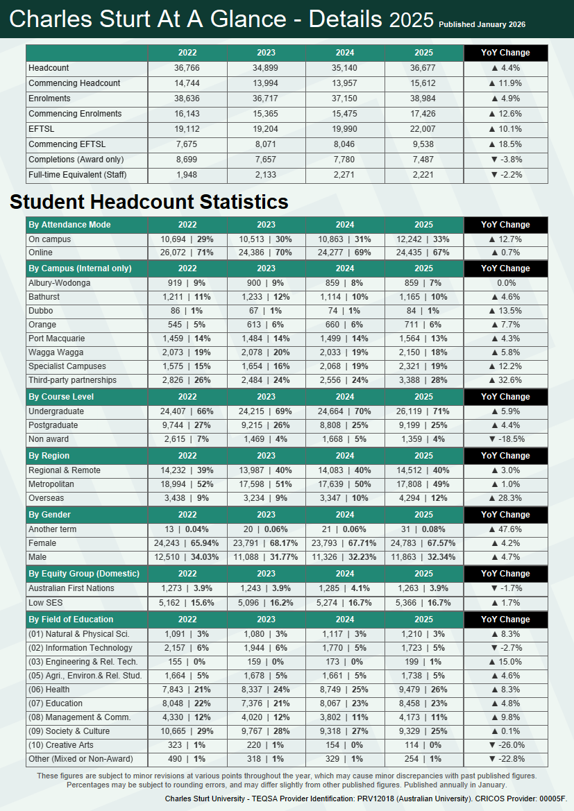This page contains information regarding Charles Sturt University's economic impact in host regions, and a summary of student demographics.