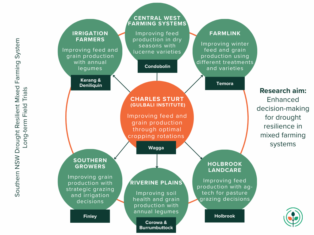 The #MixedFarmingTrials project commenced in 2023/24 and will run until 2027/28. Its structure includes seven trial sites managed by Charles Sturt University and Farming Systems Groups across Southern NSW, including Central West Farming Systems, Farmlink Research, Holbrook Landcare Network, Irrigation Farmers Network, Riverine Plains and Southern Growers.